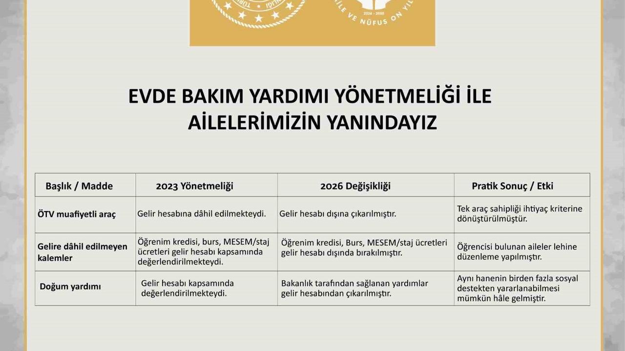 Buna göre, hane gelirinin hesaplanmasına ilişkin usul ve esaslar, evde bakımdan yararlananların lehine olacak şekilde yeniden düzenlendi. Değişiklik, özellikle taşınmaz, araç ve bazı sosyal ve eğitim destek ödemelerinin hane gelir hesabına dahil edilme biçiminde sadeleştirme ve netleştirme sağlayacak.